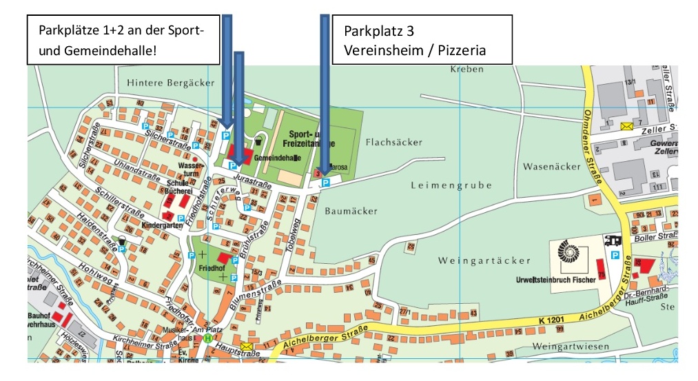 Parken können Sie vor und seitlich/hinter der Gemeindehalle Parkplätze 1+2. Die Umkleidekabinen befinden sich auch in der Sport-und Gemeindehalle!